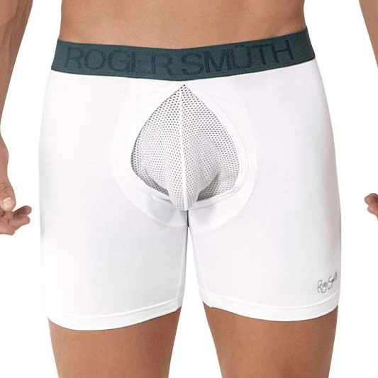 Boxer Roger Smuth RS010. Boxer très sportif grâce à son empiècement en tissu mesh sur la poche avant du Boxer et à l’arrière. Ceinture élastique logotée au nom de la marque. 87% Nylon, 13% Elasthanne.