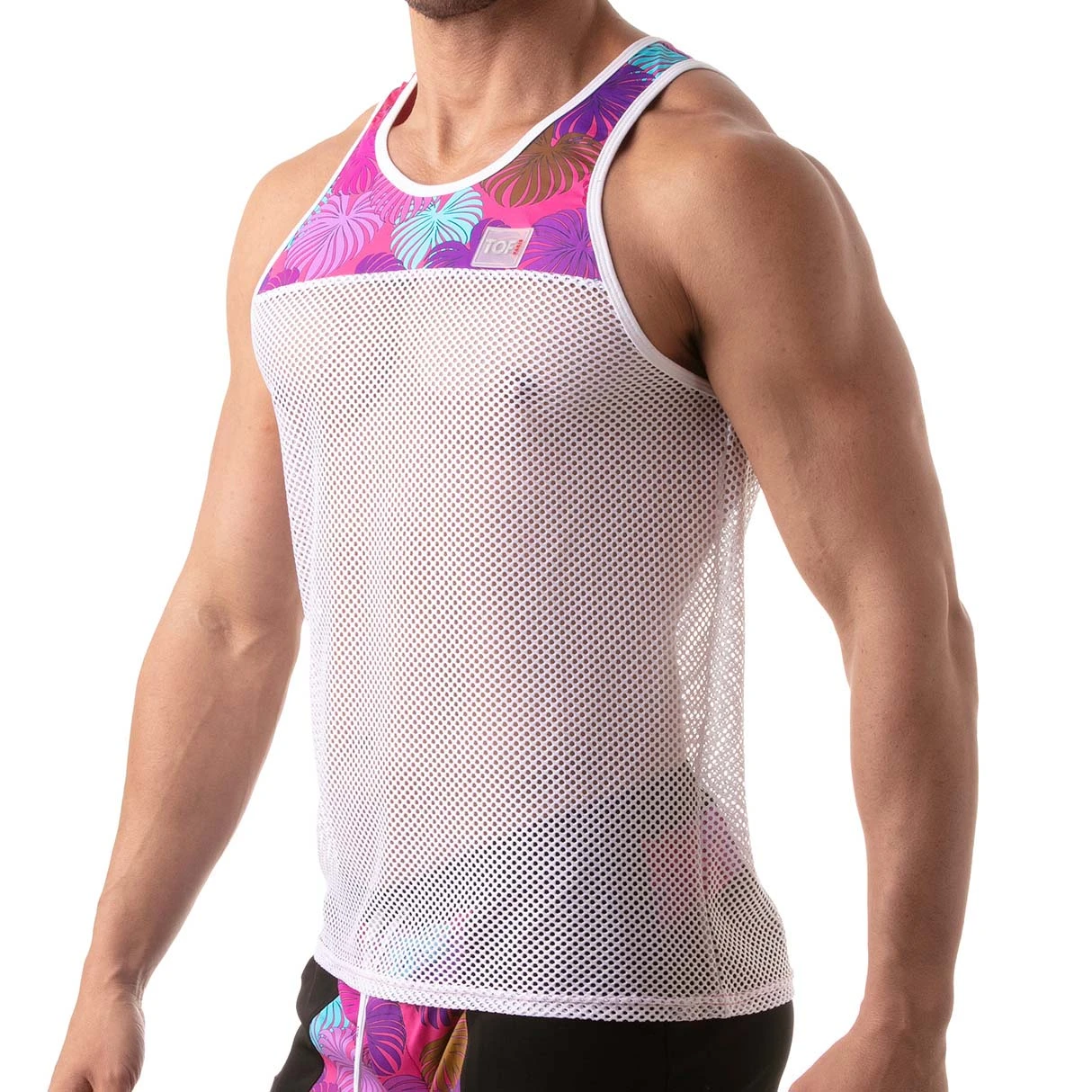 Débardeur Floral Mesh TOF PARIS TOF196P. Débardeur bi-matière en mesh et microfibre polyamide. Dans une Coupe originale légèrement évasée. Empiècement en imprimé floral dos et devant. Tissu ajouré. Logo TOF en silicone cousu sur la poitrine. 86% Polyamide, 14% Elasthanne.