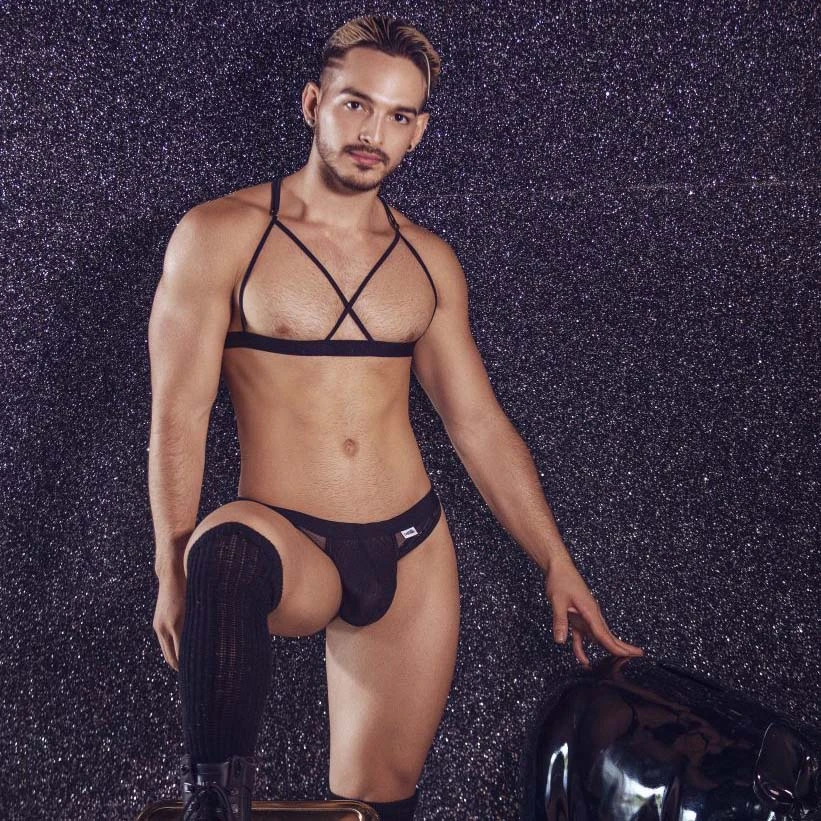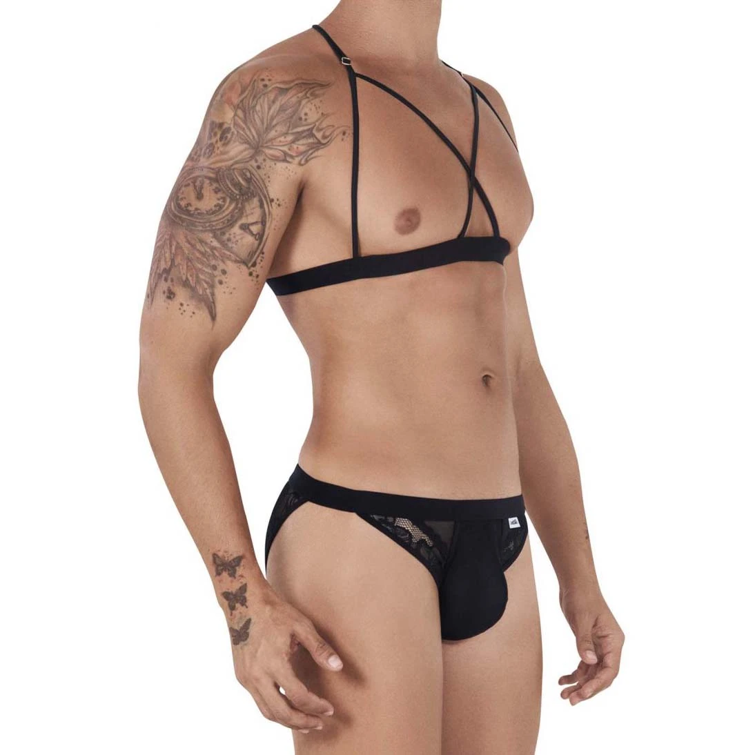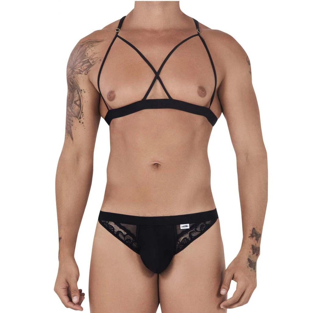 Ensemble Candyman 99521. Ensemble slip et haut. Haut style brassière totalement ouverte, bretelles reglables, lannières dans le dos. Slip Taille basse, avec empiècements de dentelle. Pochette opaque. 78% Polyester, 22% Elasthanne.
