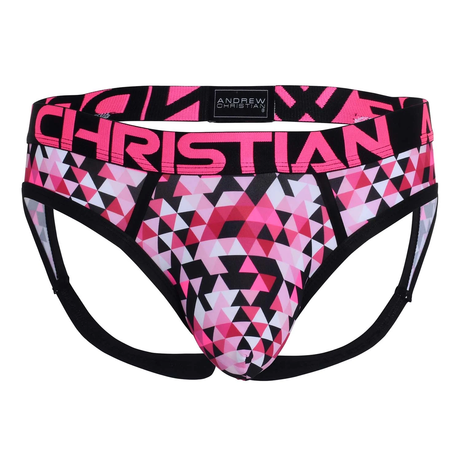 Jock Strap Andrew Christian Triangles Frame 92546. Ceinture élastique logotée Andrew Chistian. Poche avant almost naked qui offre un excellent maintien. Tissu trÚs confortable, vous allez adorer le porter. Imprimés géométriques. 90% Polymide, 10% Elasthanne.