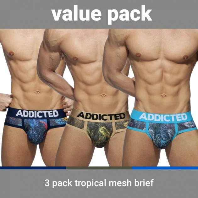 Pack de 3 Slips Addicted Tropical AD889P. Tissu mesh respirant et confortable. Imprimé tropical dans 3 couleurs différentes : or, turquoise & bleu marine. Poche push up pour augmenter votre volume frontal. Ceinture élastique logotée Addicted. Excellent rapport qualité prix. 80% Polyester, 10% Elasthanne, 10% Polyamide.