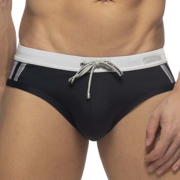 Slip de Bain Addicted Black Striped ADS281. Mettez en avant vos atouts avec le système Pack Up amovible (mousse fine et discrète) sur le devant pour un galbe parfait même lorsque vous sortez de l eau. Ceinture élastique avec cordon de serrage jaune logoté Addicted. Logo AD en silicone sur la ceinture. Bandes verticales de chaque côté. 80% Polyamide, 20% Elasthanne.