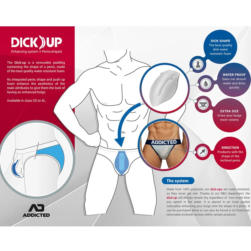 Slip de Bain Addicted Dick Up ADS237. Vous allez adorer sa poche frontale avec le systeme Dick Up intégré et non amovible pour un effet push Up Maximal. Ce système reproduit les carractéristiques de votre sexe pour un effet naturel même lorsque vous sortez de l eau. Ceinture élastique avec le logo AD en silicone. . 80% Polyamide, 20% Elasthanne.