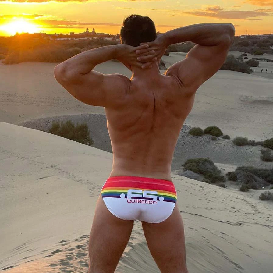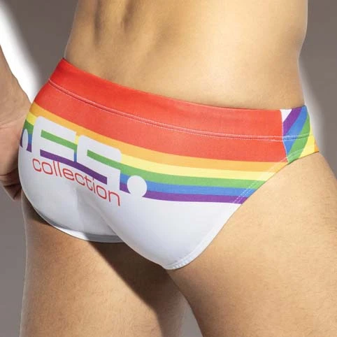 Slip de Bain ES Collection Rainbow 2101. Mettez en avant vos atouts avec le système Pack Up amovible (mousse fine et discrète) sur le devant pour un galbe parfait même lorsque vous sortez de leau. Cordon de serrage rouge. Rayures aux couleurs de larc en ciel. Logoté ES Collection à larrière. 80% Polyester, 20% Élasthanne.
