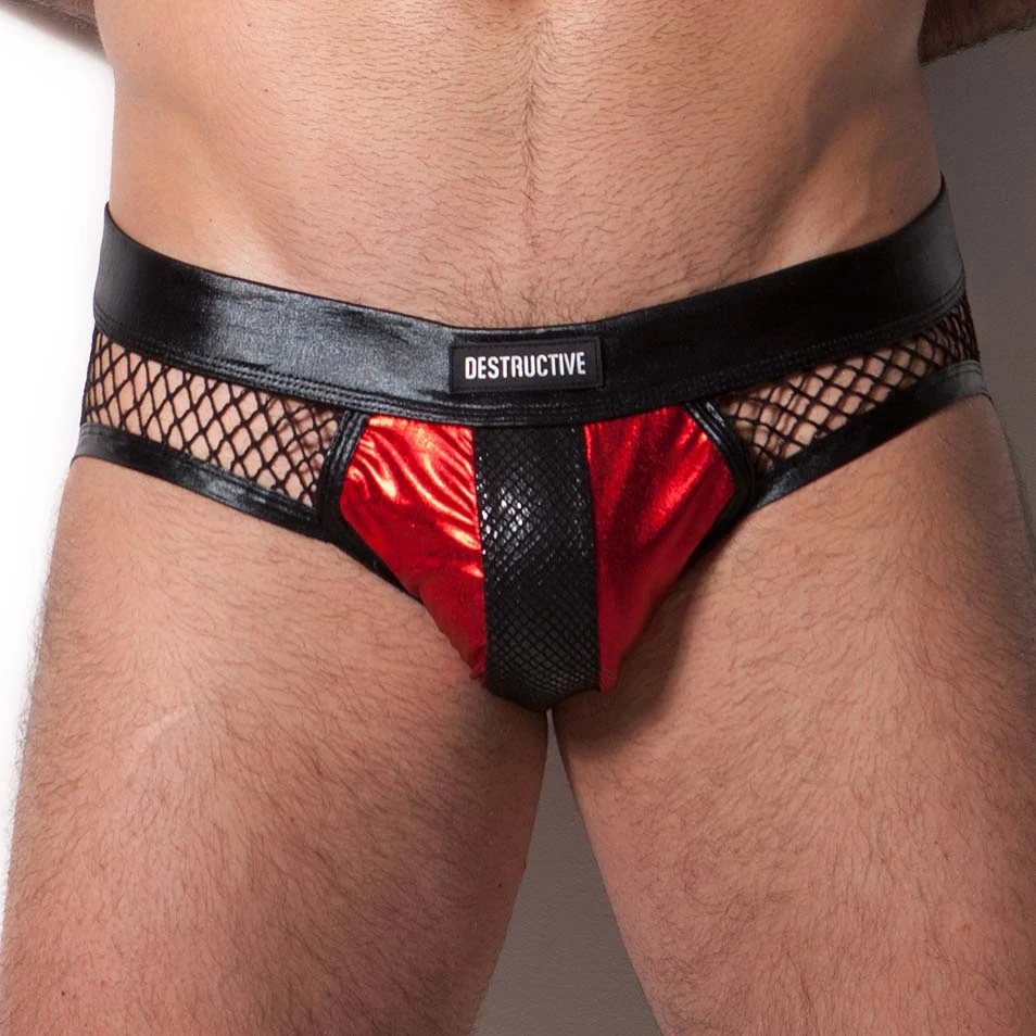 Slip DESTRUCTIVE 1DS02. Slip très sexy en résille sur l’arrière et de chaque côtés. Matière brillante. Ceinture élastique. Empiècement sur la poche avant en python. Logo DESTRUCTIVE en silicone sur la ceinture. Guide desTailles : S 75-80cm, M 80-90cm, L 90-101cm, XL 101-110cm. 80 % Polyamide, 20% Elasthanne.