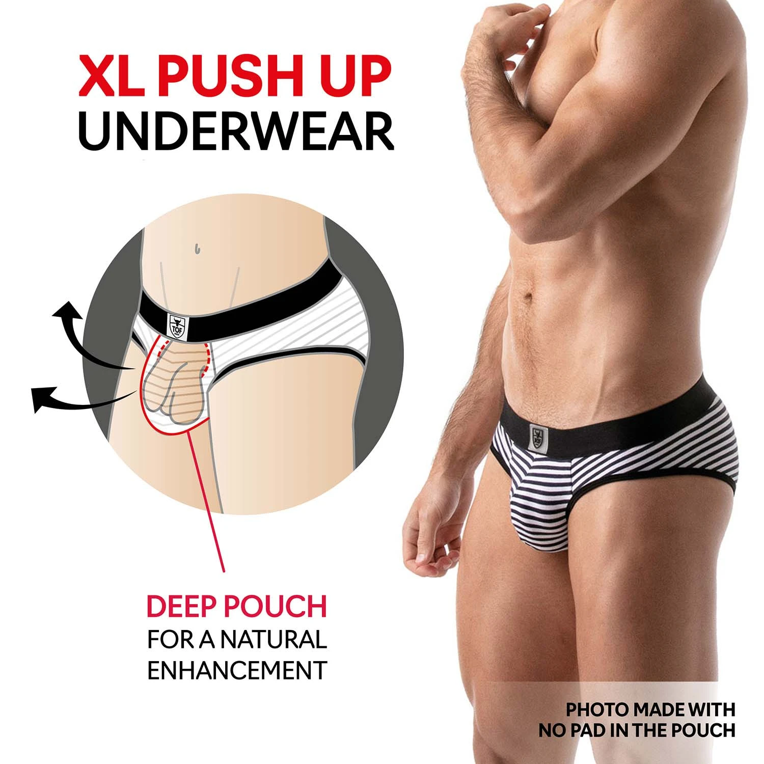 Slip Empty Bottom Stripes TOF PARIS TOF103N. Slip Empty Bottom mariniÚre en tissu strech doux et confortable. Poche frontale doublée avec un effet push-up qui vous assure un excellent maintien.TrÚs agréable à porter. Ceinture élastique logotée au nom de la marque. Slip Empty Bottom échancré qui accentue le galbe des fesses. 96% Coton, 4% Elasthanne.