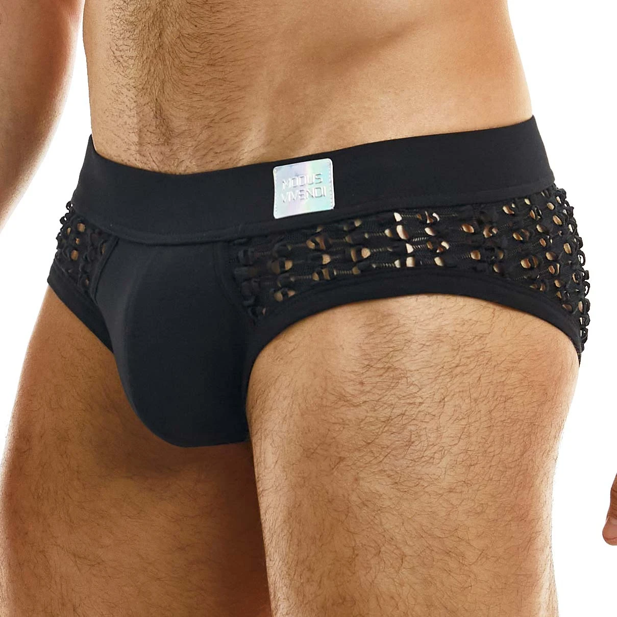Slip Modus Vivendi Hole 02313. Modus Vivendi présente la gamme Hole. Slip taille basse dans une coupe ajustée en tissu tricoté style crochet, finitions en coton côtelé. Ceinture élastique logotée au nom de la marque. 60% Coton, 40% Polyester.