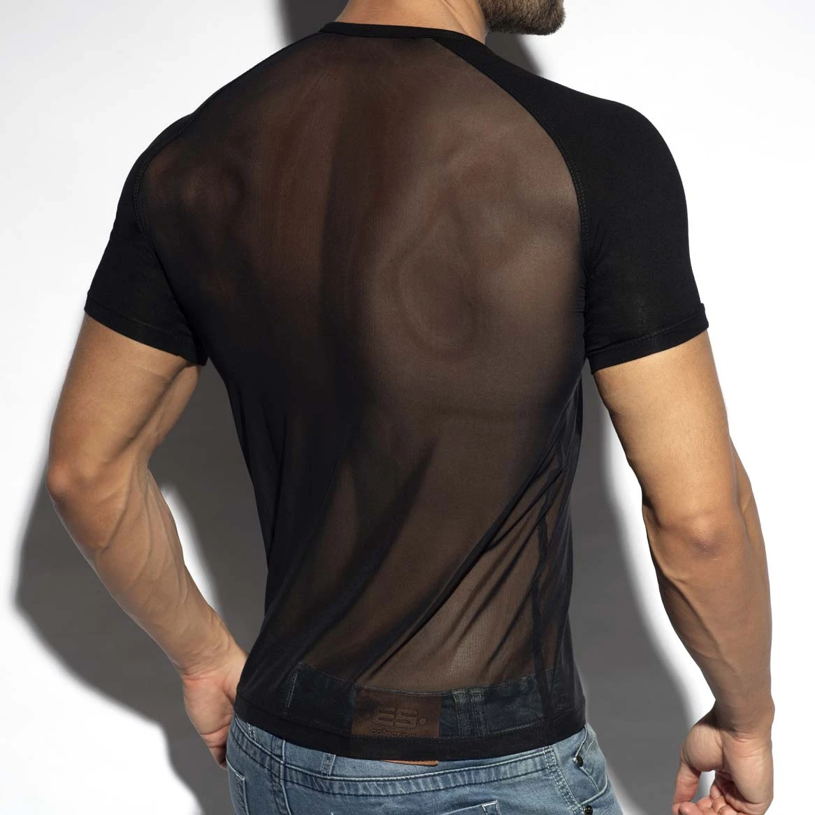 T-Shirt ES Collection Ranglan Net TS310. T-Shirt col rond. Très près du corps. Matière extensible. Le style Ranglan signifie que les épaules et les manches sont faites d’un tissu plus épais, non transparent, tandis que le reste du vêtement est transparent. Étiquette en silicone ES Collection sur la poitrine gauche. 75% Polyamide, 20% Viscose, 5% Elastane.